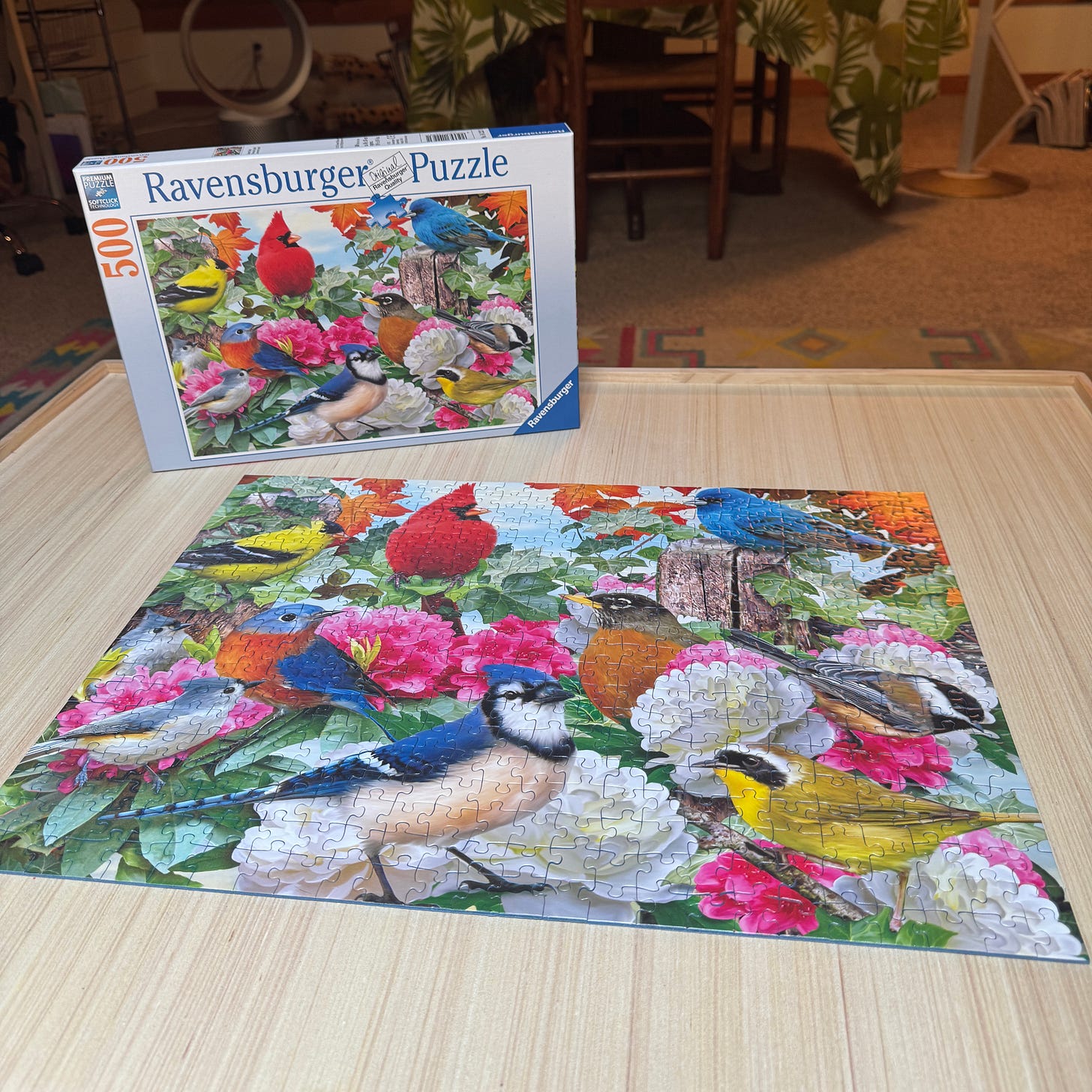 We bought this house late last year and I spent a lot of time thinking about who I’d be when we moved in. In hopes that I would become a chilled out, puzzle person, I asked my father-in-law for a puzzle table for Christmas. It’s a fancy one with adjustable legs and drawers for puzzle pieces. But I wasn’t using it, until I started noticing how many jigsaw puzzles are at thrift stores. On a whim I bought a 500 piece puzzle with a bunch of birds on it for a dollar. Then I got out my table and put the puzzle together while listening to the Atmosphere audiobook.